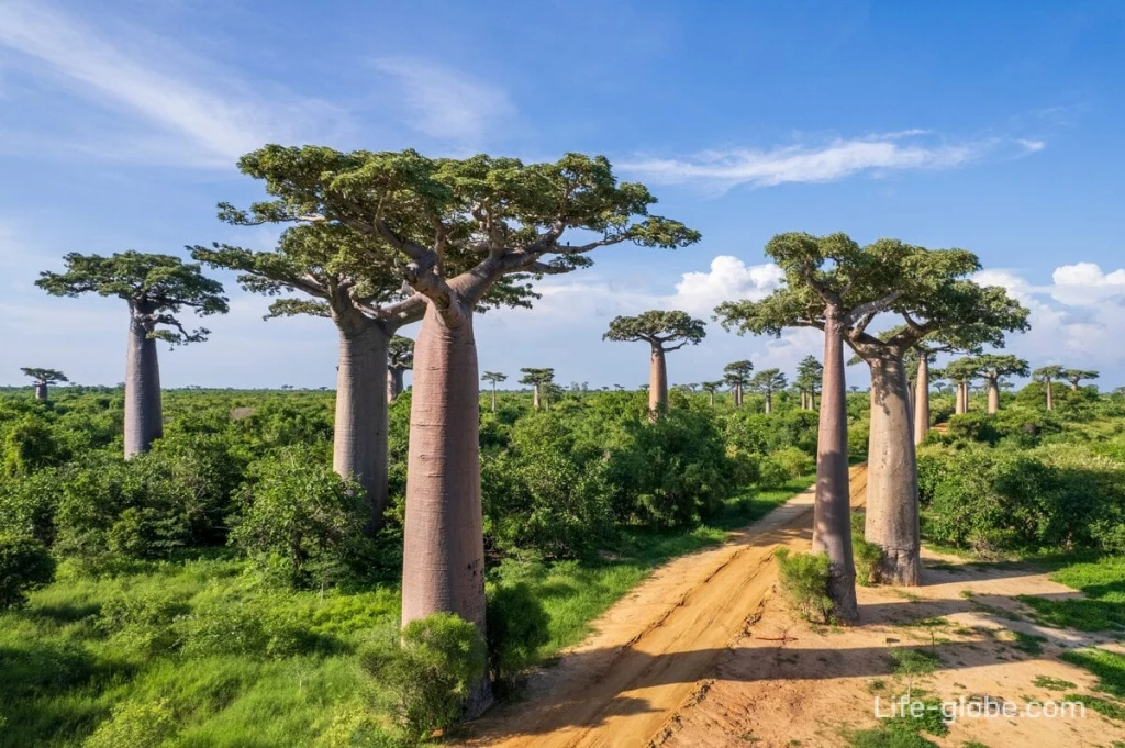 Грунтовая дорога между городами Морондава и Белони-Цирибихина проходит через самое фотографируемое место Мадагаскара. Вдоль нее выстроились в ряд древние баобабы возрастом до 800 лет. Эти гиганты высотой до 30 метров — все, что осталось от густого леса, который когда-то покрывал остров. На закате Аллея баобабов окрашивается в золотые и красные тона, создавая магическую атмосферу.