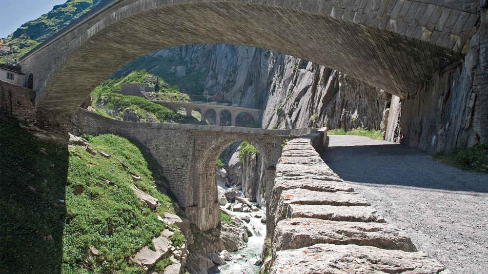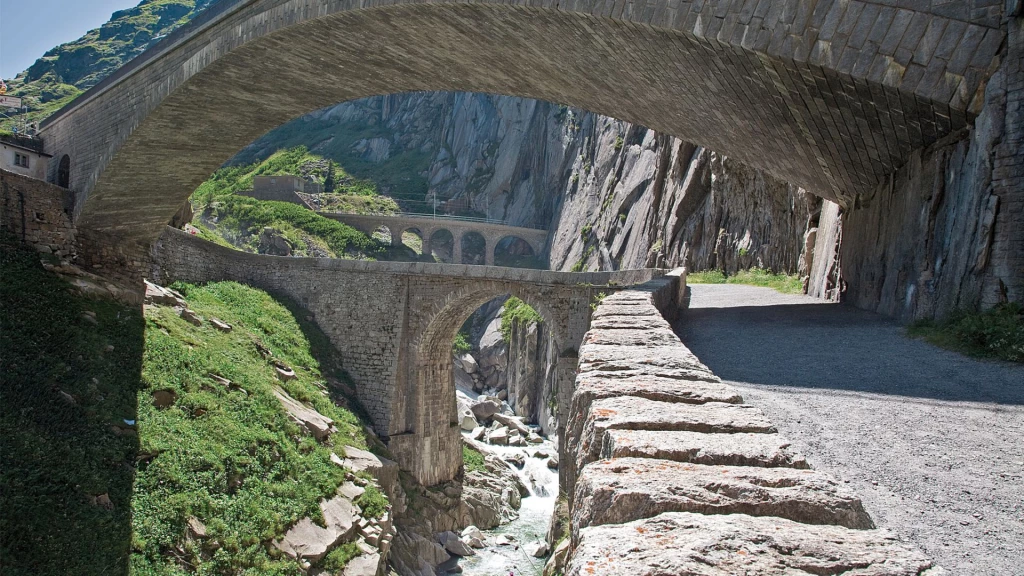 Историческая дорога через Альпы соединяет Италию и Швейцарию с XIII века. Современный серпантин насчитывает десятки крутых поворотов и поднимается на высоту 2106 метров. Весной здесь можно проехать между стенами снега высотой в несколько метров — незабываемое зрелище. Перевал окружен альпийскими лугами, ледниковыми озерами и старинными каменными мостами, которым сотни лет.