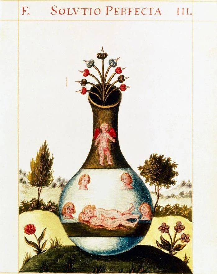 Миниатюра из алхимического трактата Георга Аураха Страсбургского «Драгоценнейший дар Божий». Издание XVII века Источник: DEA PICTURE LIBRARY / Contributor / Getty Images