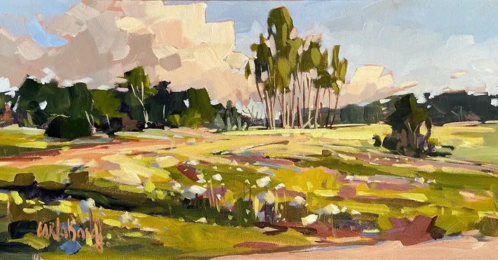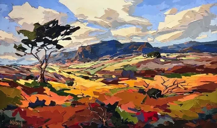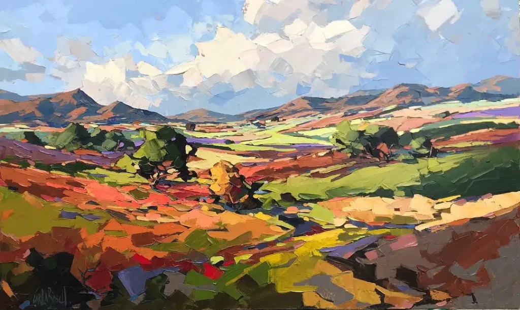 Я так не думаю. Восприятие происходит не чисто визуально. Вокруг не просто камни, деревья и цветы. Как насчет запаха, прикосновения, звуков, истории и личного опыта, работающих вместе, создающих эмоции, которые производят на вас впечатление? В конечном счете, вы видите пейзаж не только глазами. Я стараюсь донести этот контекст через свой смелый импрессионистический стиль. Моя цель — привести вас в этот опыт, я хочу, чтобы вы почувствовали эмоции прекрасного пейзажа, ощутили праздник красоты жизни”.