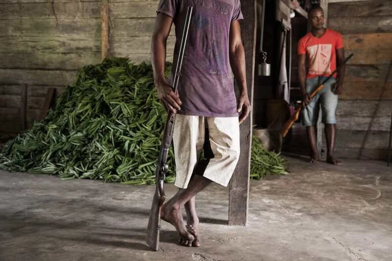 Вооруженные охранники охраняют кучу стручков ванили в Бемаламатре, Мадагаскар.