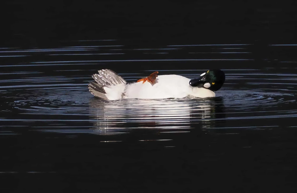 Этот снимок был сделан в очень хмурый, серый день. Но когда утка мирно качалась на волнах морского залива, сквозь тучи внезапно пробился луч света и подсветил её — в тот же миг птица словно поймала отпускное настроение.