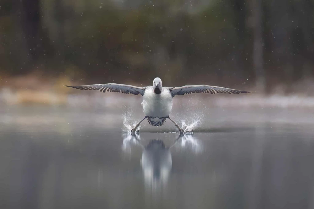 Я фотографирую краснозобых гагар уже несколько лет. Обычно я лежу на краю пруда под маскировочной сеткой и снимаю их весенние брачные игры из своего укрытия. Тем утром меня застал врасплох не по сезону ранний снегопад: густые хлопья сменились редкой порошей, а над поверхностью озера поднялся тонкий туман. Краснозобая гагара — довольно посредственный летун, и её приземление обычно выглядит очень неуклюже: птица ловит баланс, вытянув лапы назад, а затем приземляется на брюхо и скользит по инерции. Мне нравится говорить, что они используют воду как взлетно-посадочную полосу.