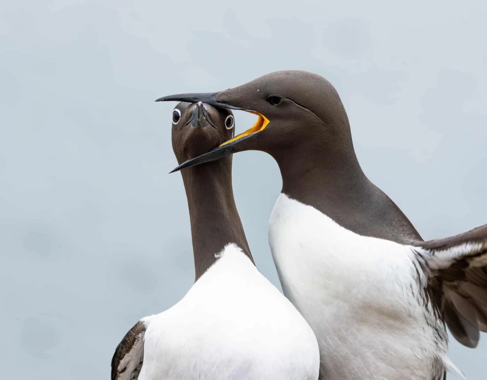 Эти тонкоклювые кайры гнездились на узком скалистом выступе, где свободное место было на вес золота. Гнёзда были набиты так плотно, что на добрососедские отношения рассчитывать не приходилось — кайры яростно защищают свою территорию. Стычки и битвы за место под солнцем здесь случаются постоянно. Мне удалось поймать кадр с этой ошарашенной очковой кайрой, чья голова оказалась намертво зажата в клюве соседа. Мне понравилось, как птица смотрит прямо в объектив, а белые «очки» вокруг глаз только подчеркивают всю комичность её безвыходного положения! Иногда соседи так достают, что хочется буквально откусить им голову...