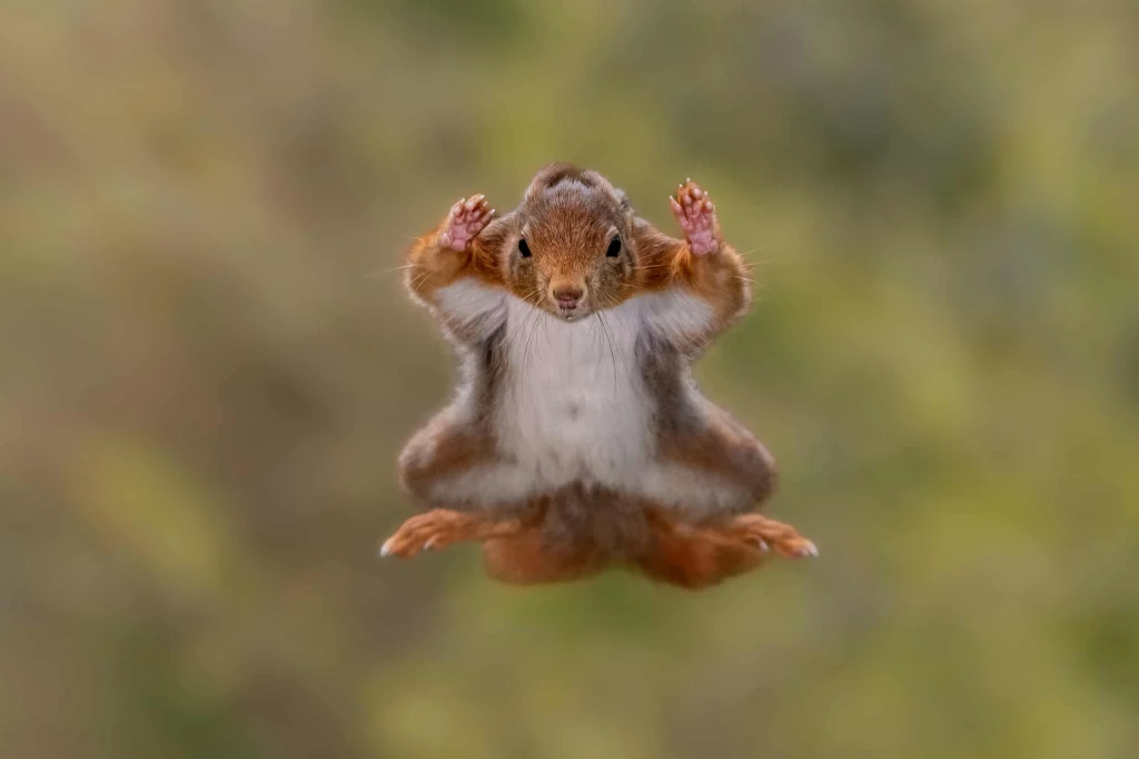 Несколько лет назад недалеко от моего дома можно было арендовать простую деревянную засидку в лесу, знаменитом своей популяризацией рыжих белок. Я бывал там не раз и со временем начал экспериментировать, пытаясь поймать белок прямо в прыжке. Результатом стали бесчисленные размытые кадры, но среди них попадались и по-настоящему забавные моменты — вроде того, что я отправил на конкурс. К сожалению, тот лес уже вырубили из-за нашествия жуков-короедов. Глядя на это фото, кажется, будто летящая белка решила «выбросить белый флаг» прямо в воздухе: лапки в стороны — полная капитуляция!
