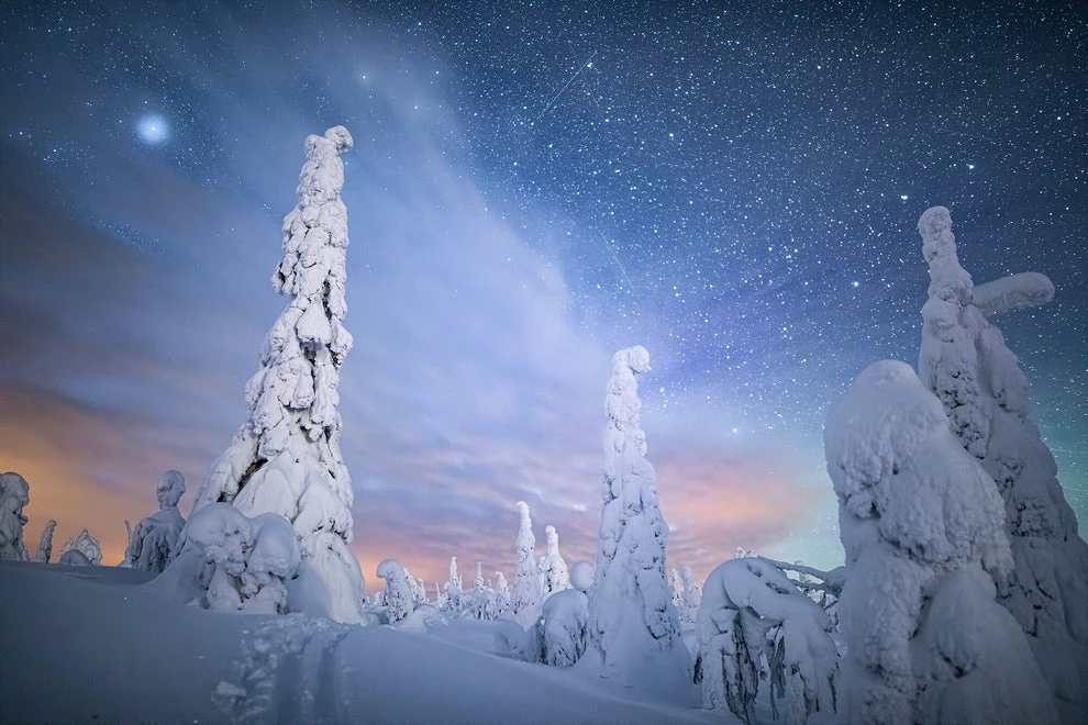 Особое место в творчестве фотографа занимает ночная съемка, ставшая ее визитной карточкой благодаря уникальному умению работать с северным сиянием и звездным небом без излишней цифровой обработки. Тёрмянен мастерски использует искусственный свет, выделяя одинокие заснеженные деревья, которые под ее объективом превращаются в причудливые скульптуры, напоминающие инопланетные формы жизни. В отличие от многих коллег, стремящихся к идеальной симметрии, Тиина ищет в ландшафте эмоциональный отклик, передавая через снимки то глубокое чувство изоляции и одновременно единства с миром, которое можно испытать только в условиях полярной ночи.