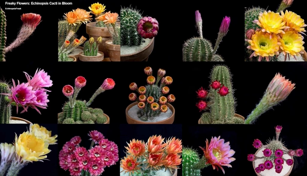«Эхинопсисы цветут ночью, и цветы держатся всего один день. Пик их красоты длится в течение одного-двух часов... все кактусы в этом видео из моей коллекции... Большинство смонтированных клипов показывают около 8 часов изменений, как цветы распускаются, цветут и отцветают...»