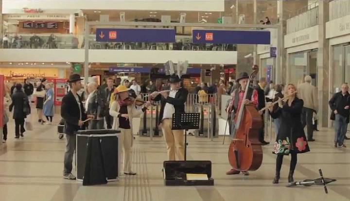 Флешмоб солистов, хора и оркестра Венской Оперы на вокзале Вены |