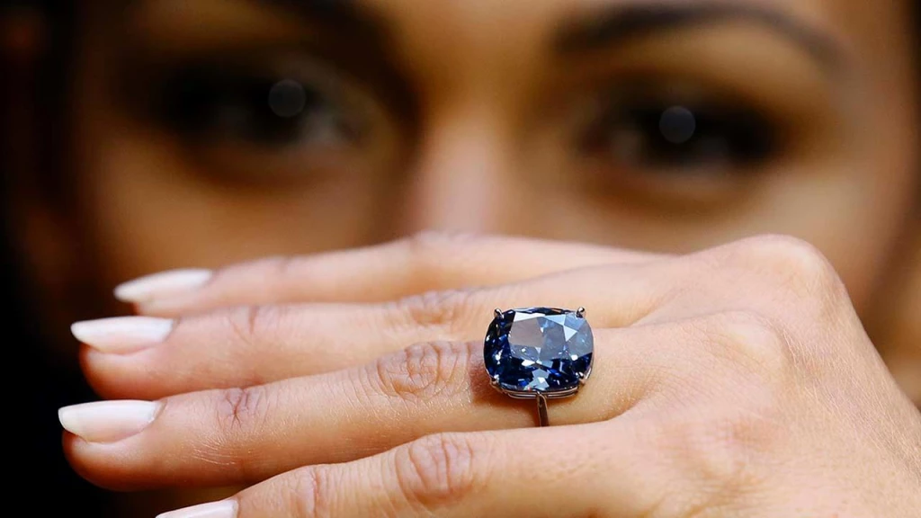 Бриллиант «Голубая луна», проданный за 48,5 млн долларов на женевском аукционе Sotheby's в 2015 году.