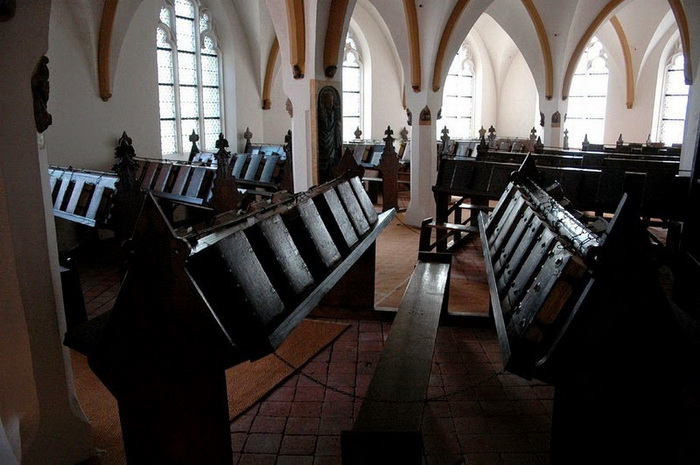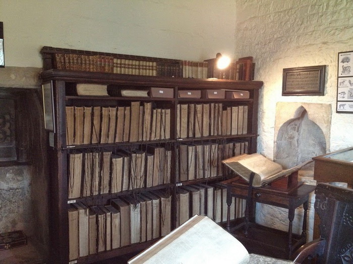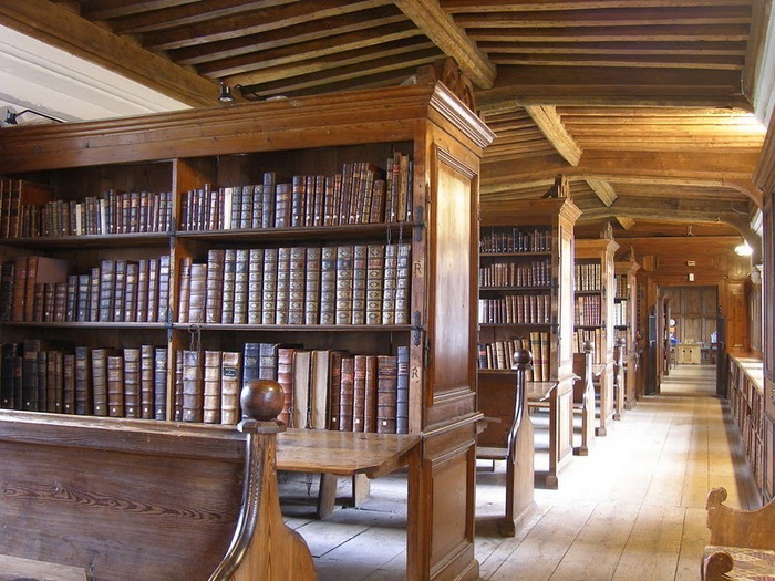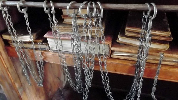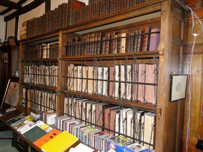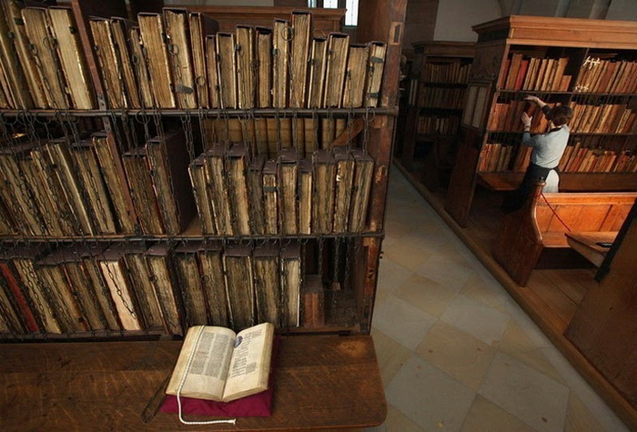 Сегодня нам это кажется дикостью, но в средневековых библиотеках стеллажи были оборудованы специальными кольцами для цепей, которые были достаточно длинными, чтобы с книгой можно было работать, но в то же время вынести ее из помещения было невозможно. Книги на полках стояли иначе, чем сегодня, - корешком от читателя. Это позволяло не запутывать цепь, когда книгу снимали с полки.