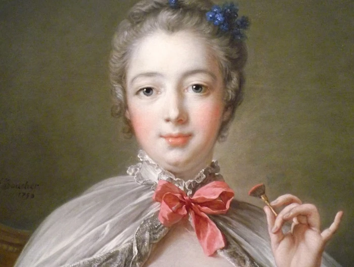 Ф. Буше. Маркиза де Помпадур наносит румяна перед зеркалом. Фрагмент